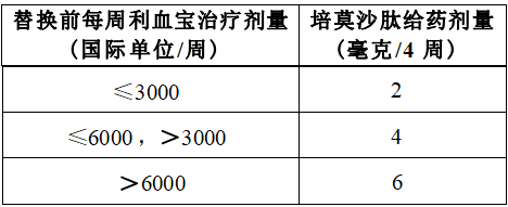 如果为使Hb维持在10.0g/dL以上而需要上调培莫沙肽给药剂量,可按照当前用药剂量约25%或50%的比例每4周上调用药剂量。